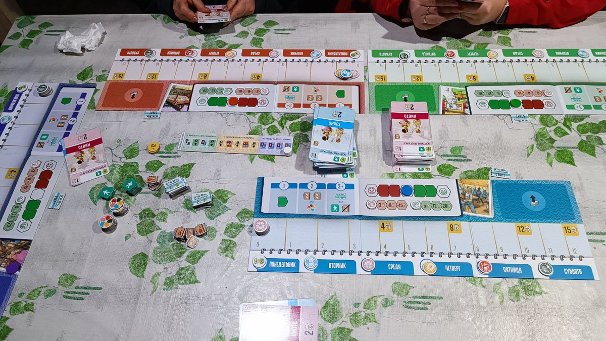 Из-за строительства нашей игровой зоны на даче - навеса перед баней, снова играли не много. По сути в одну игру. Наконец то показал маме игру "Поехали в Японию". Объяснения правил маме закончилось на традиционной фразе: ничего не понятно, давай играть, там разберемся. Правила у игры простые, но есть нюансы, которые проще объяснить во время партии. Так и получилось, два первых раунд мы маме подсказывали, а дальше она играла самостоятельно. Мы играли на улице вечером. Уже стемнело, и стало стремительно холодать. Лиза даже попросила налить ей кипяток в кружку, чтобы руки погреть. Отыграли полную партию, но на подсчет очков Лиза с мамой ушли в дом греться. Игра занимает достаточно много места, поэтому в доме играть не вариант. Я сыграл не очень хорошо, перед двумя последними раундами в понедельник лежала только одна карта, и в итоге пришлось выкладывать не очень выгодные карты. В итоге, мама набрала 101 ПО, я 114 , Лиза 124, а победила Женя, набрав 128 ПО. Игра классная, маме она понравил