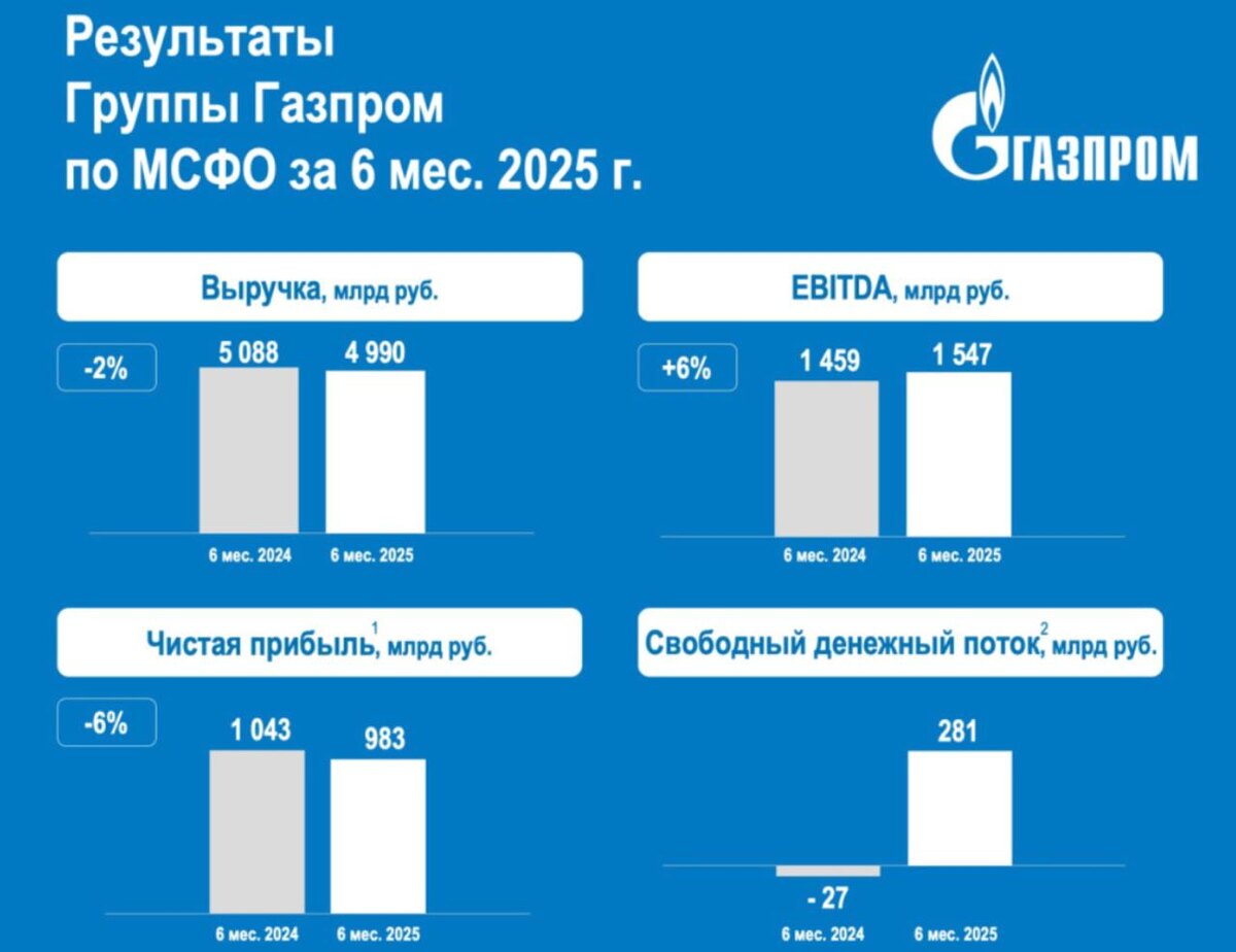Стартуем новую рабочую неделю. На ней сосредоточимся на нефтегазовом секторе. Все силы сейчас бросил на разбор отчетов за полугодие. Сразу скажу, что даже невооруженным глазом видно, как высокая ставка сжирает доходы компаний. Правда Газпрома это не коснулось на этот раз. Сегодня разбираем его отчет и перспективы. Ну и конечно же по последним новостям из Поднебесной пробежимся. ⛽️ Итак, выручка компании за первое полугодие 2025 года символически снизилась на 1,9% до 5 трлн рублей. По-прежнему основной вклад в нее делает нефтяной сегмент в лице Газпромнефти. Так, выручка от продаж сырой нефти занимает долю в 44% от общих продаж, правда немного снизилась год к году до 2,2 трлн рублей. Мешают росту низкие цены на нефть, особенно это касается нашей Urals. А вот продажи газа выросли за полугодие на 9,9% до 2,3 трлн рублей. Экспорт газа занимает долю в 69%. Напомню, что основные продажи идут через Турецкий и Голубой потоки, а также через Силу Сибири-1. Причем последний газопровод загружен по