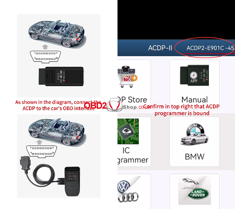 Подключите устройство ACDP к интерфейсу OBD автомобиля, как показано на рисунке.