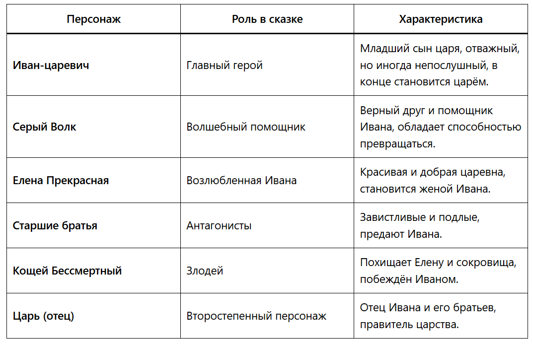 Сказка "Иван-царевич и Серый Волк" рассказывает о приключениях младшего сына царя, который с помощью волшебного Серого Волка находит Жар-птицу, прекрасную жену и верного коня, побеждает завистливых братьев и злобного Кощея, а впоследствии становится царём. В некотором царстве жил царь (в разных вариантах его зовут Демьян, Демьян Данилович или Берендей), у которого было три сына: два старших (Клим и Пётр, либо Димитрий и Василий) и младший — Иван. В царском саду росла яблоня с золотыми яблоками, которые кто-то начал воровать. Сыновья по очереди отправлялись стеречь сад. Старшие братья засыпали на посту, а младший, Иван-царевич, смог выследить вора — им оказалась Жар-птица. Ивану удалось ухватить её за хвост, но птица вырвалась, оставив в его руке перо. Царь захотел заполучить саму Жар-птицу и отправил сыновей на её поиски. На пути Иван встретил каменный столб с предсказаниями о трёх дорогах. Выбрав дорогу, где он останется жив, но потеряет коня, Иван встретил Серого Волка, который съел