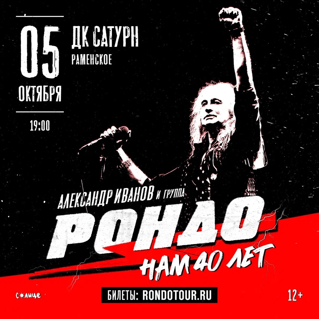 ⚡Дорогие друзья! Очень скоро, а именно 5 октября, будем рады видеть вас на нашем сольном концерте, который состоится в Раменском на сцене Дворца культуры «Сатурн»! Не упустите шикарный шанс провести незабываемый музыкальный вечер, приобретайте билеты прямо сейчас! 📌 Адрес: ул. Михалевича, д. 2 ☎️ Телефон: +7 (49646) 3-20-32 📌 🎫 Немного билетов по ссылке: https://rondotour.ru/ramenskoe/16-05-25 #АлександрИванов #Рондо #группаРондо #Раменское #ДкСатурн #концерт #гастроли