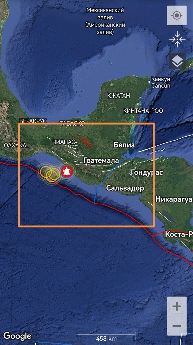 Мексика-Гватемала. Трассируется стык трех плит (Карибской, Кокос и Североамериканской) на уровне М6-7