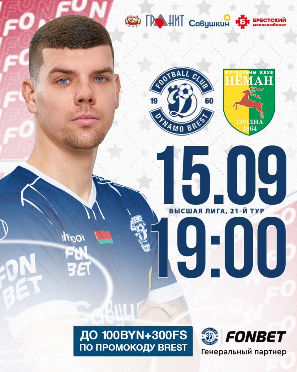 ⚽️15 сентября 2025 года в 19:00 часов на стадионе ГУ ОСК «Брестский» состоится матч по футболу между командами ФК «Динамо-Брест» – ФК