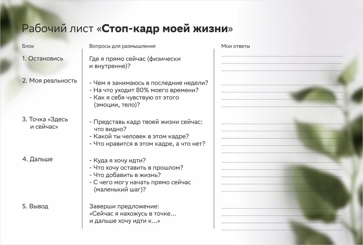 Упражнение «Стоп-кадр моей жизни» Мы часто живём в потоке задач, планов, бытовых мелочей. День пролетает — и кажется, что времени ни на что не хватает. Но если не останавливаться, легко потерять ощущение, куда вообще идёшь и ради чего стараешься. Это упражнение — как нажать на паузу и оглянуться: Оно помогает: 🟣Вынуть голову из рутины и посмотреть на свою жизнь со стороны. 🟣 Дает честный ответ на вопрос: «Где я сейчас?» — без самообмана и без лишней суеты. 🟣 Помогает понять, что нравится в твоём «сегодня», а что хочется изменить. 🟣 Даёт направление: маленький следующий шаг, который можно сделать уже сейчас. По сути, это маленькая «перезагрузка», после которой становится легче расставить приоритеты, вернуть энергию и двинуться дальше осознанно.