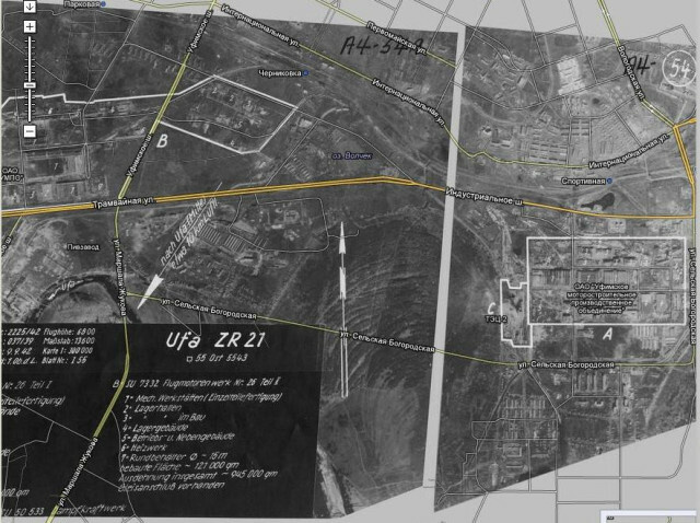 Вернёмся к фотоснимкам. На них обозначены авиамоторный завод № 26 (впоследствии УМПО и его дочерние производства), нефтеперерабатывающий завод, районы ж/д вокзала, Сафроновской пристани и Глумилино с радиостацией Коминтерна, старый аэропорт в районе современной улицы Зорге (ныне Южный автовокзал), аэродром авиамоторного завода № 26 в Максимовке и район Дёмы.