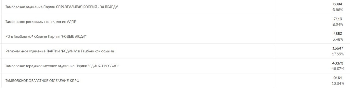 Данные о предварительных итогах голосования по единому избирательному округу на выборах депутатов Тамбовской городской Думы Тамбовской области восьмого созыва