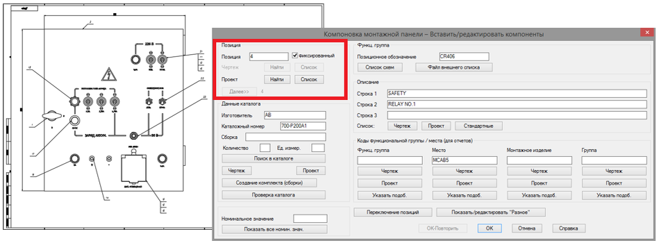 При размещении на чертеже компоновочных образов открывается диалоговое окно «Компоновка монтажной панели — Вставить/редактировать компоненты», в котором в разделе Позиция размещенным компонентам назначается номер позиции по спецификации. Номер позиции определяется каталожными данными компонента (одинаковым каталожным данным назначается одинаковый номер позиции) и хранится непосредственно в блоке компоновочного образа в виде атрибута P_ITEM или дополнительных данных Xdata VIA_WD_P_ITEM. Если в проекте уже существует компонент с такими же каталожными данными, и ему уже назначен номер позиции, то новому компоненту автоматически назначается тот же номер. В противном случае номер позиции назначается вручную. Если в поле фиксированный установлен флажок, то номер позиции компонента фиксируется и при последующем выполнении команды Изменить последовательность позиций зафиксированные номера позиций не изменяются. Кнопка «Найти» Кнопка Найти в разделе Позиция диалогового окна «Компоновка монтажн