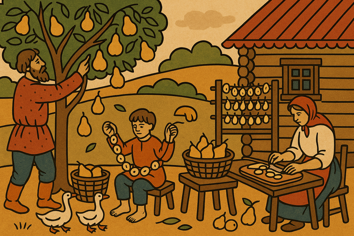 Середина сентября — самое время для груши. В саду тихо звякают корзины, у крыльца сушатся дольки, а в тетрадке запасов появляется новая строка. Сегодняшний день — про терпение и красоту: неторопливо, аккуратно, понемногу. «Груша не терпит суеты, — говорила баба Варя. — Её надо слушать ножом: он подскажет, где тоньше резать. А на нитке дольки сушатся ровнее, чем на противне: каждая обнимает воздух и становится янтарной». 1) Дольки на нитке 2) Пряный компот «к ужину» 3) Грушевое пюре «на пастилу» Под настроение к вечеру — любимая «каша с тыквой из печи»: https://dzen.ru/a/aBW1Owq7tArJkWSQ
