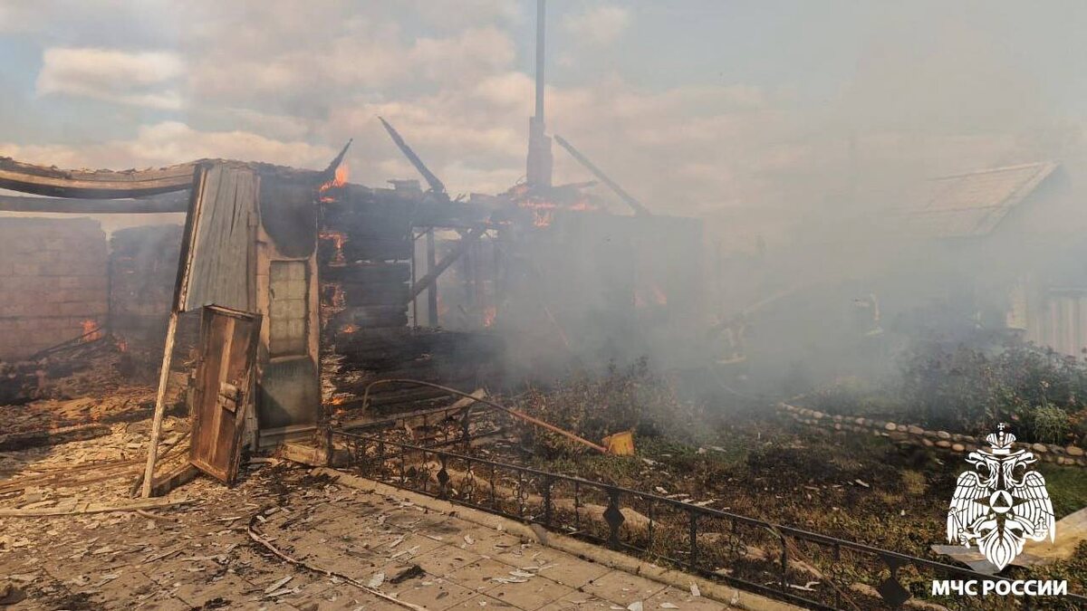 «На момент прибытия первого подразделения дом и надворные постройки горели открытым пламенем, произошло обрушение конструкций», — говорится в сообщении ведомства.