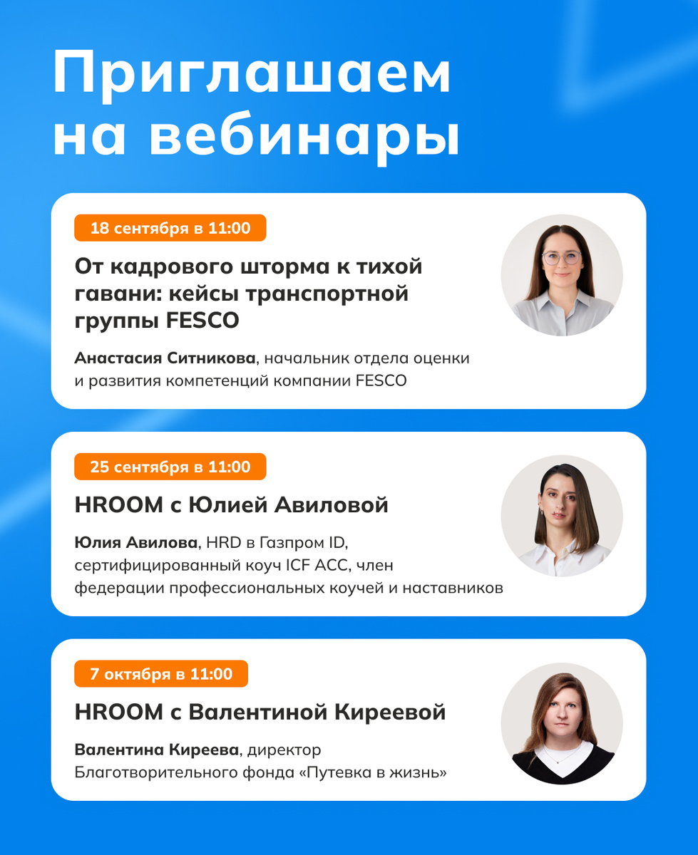 - 18 сентября в 11:00 состоится вебинар «От кадрового шторма к тихой гавани: кейсы транспортной группы FESCO». Спикер – Анастасия Ситникова, начальник отдела оценки и развития компетенций компании FESCO. Зарегистрироваться