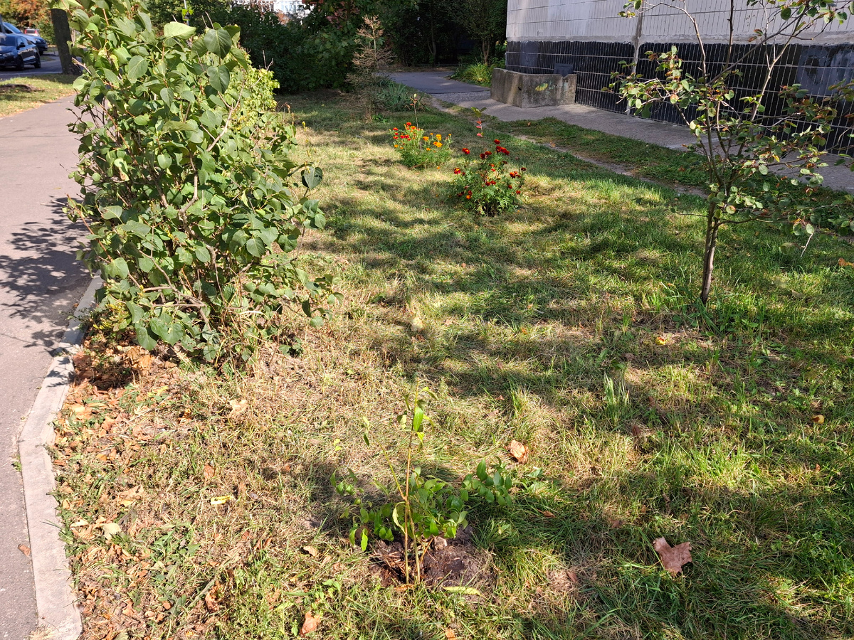 Вдали видна черноплодная рябина в окружении бархатцев. Очередной раз косили траву на газоне, эти кустики черноплодной рябины в бархатцах сохранились.