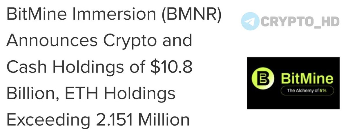 π ΠΠΌΠ΅ΡΠΈΠΊΠ°Π½ΡΠΊΠ°Ρ ΠΌΠ°ΠΉΠ½ΠΈΠ½Π³ΠΎΠ²Π°Ρ ΠΊΠΎΠΌΠΏΠ°Π½ΠΈΡ BitMine ΠΊΡΠΏΠΈΠ»Π° #ETH ΠΏΠΎΡΡΠΈ Π½Π° $10,000,000,000 β ΡΠ΅Π»ΠΈΠ· ΠΠ° Π±Π°Π»Π°Π½ΡΠ΅: 2,151,676 ETH ($9,97b), 192 BTC ($22m), $214,000,000 Π² Π°ΠΊΡΠΈΡΡ