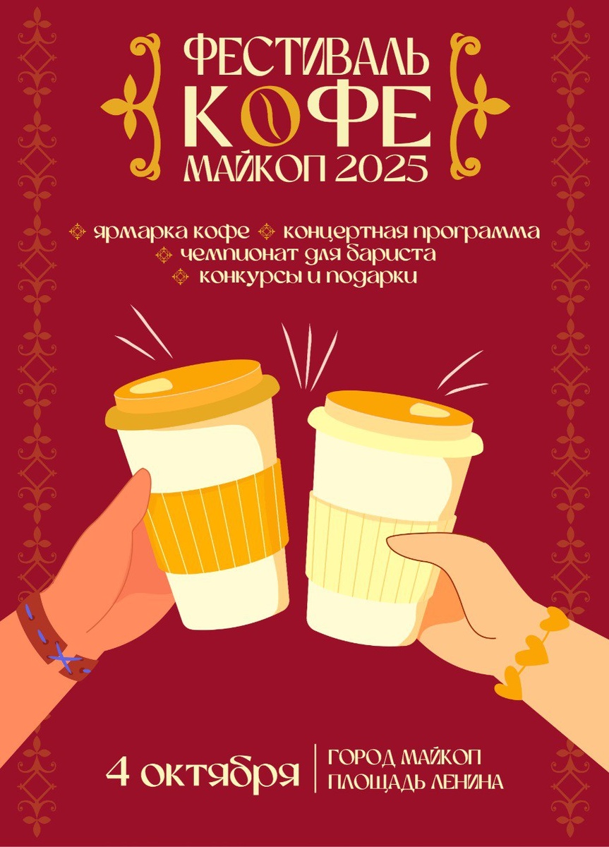 Майкопчане и гости города приглашаются на первый Фестиваль кофе ☕️ 4 октября в столице Адыгеи впервые пройдёт масштабный гастрономический праздник — Фестиваль кофе. Жителей и гостей Майкопа ждут разнообразные интерактивные площадки, где можно будет не только попробовать разные сорта любимого напитка, но и принять участие в мастер-классах и конкурсах. ✔️Для посетителей праздника будут организованы: 🟢 праздничная ярмарка с продукцией городских кофеен; 🟢 мастер-классы от лучших бариста; 🟢 концерт с участием творческих коллективов Майкопа и приглашённых артистов; 🟢 конкурсы для гостей праздника и многое другое. Приходите на самый ароматный праздник осени!