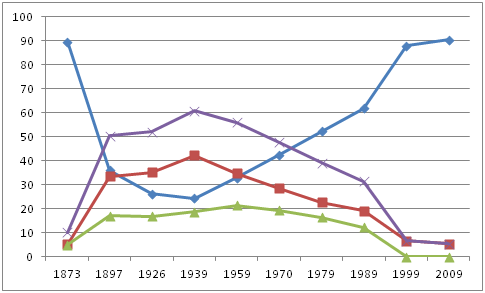Синий цвет - азербайджанцы, красный – русские, зеленый –армяне, фиолетовый - суммарное количество христианского населения.