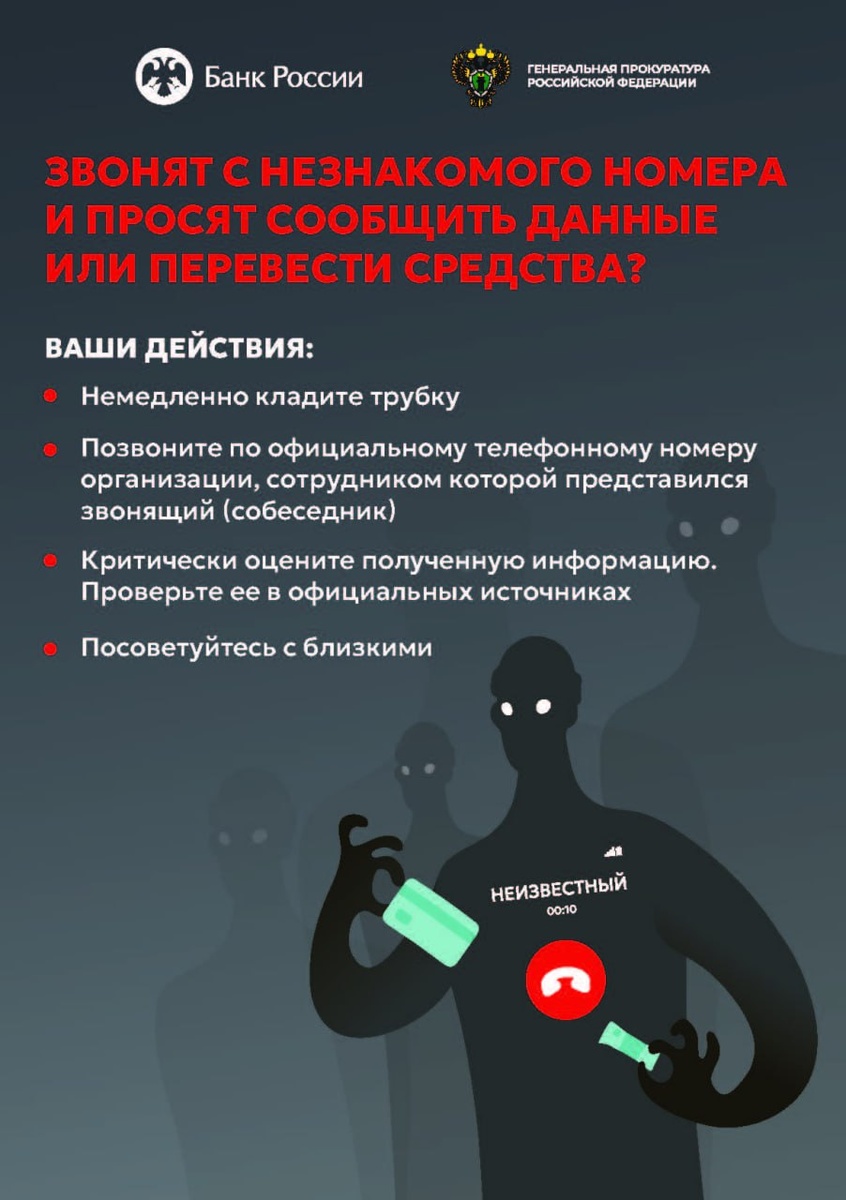 В рамках профилактической работы Генеральная прокуратура РФ и Банк России разработали информационный баннер с правилами безопасности от кибермошенников. Необходимо помнить: если вам звонят с незнакомого номера и просят сообщить личные данные или перевести деньги — это мошенники. Даже если звонящий представляется сотрудником банка, никогда не называйте ему свои данные: ФИО, паспортные данные, номера карт, а главное — коды из SMS. Лучше сразу прекратите разговор. Чтобы защититься от мошенников, необходимо следовать простым правилам: - никому не сообщайте конфиденциальную информацию: пароли, коды из SMS, данные карт и паспорта, - никогда не переводите деньги незнакомцам, даже если вас убеждают, что это необходимо «для безопасности», «подтверждения личности», «возврата ошибочного платежа» или «блокировки счета», - не ведите диалог с подозрительным собеседником. Просто положите трубку, - для проверки информации перезвоните в банк или организацию, от имени которой звонили, по официальному но