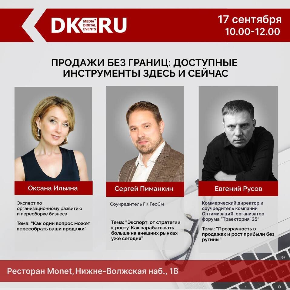 24 сентября в Нижнем Новгороде пройдет бизнес-завтрак на тему «Продажи без границ: доступные инструменты для бизнеса здесь и сейчас». Бизнес-завтрак DK.RU предлагает актуальную для бизнеса повестку дня. В рамках мероприятия обсуждаются важные темы с профессионалами отрасли. Общение проходит в формате свободного диалога за завтраком. Участники также имеют возможность задать интересующие их вопросы. Оксана Ильина, эксперт по организационному развитию и пересборке бизнеса выступит с темой: «Как один вопрос может пересобрать ваши продажи». Вы узнаете, как сместить фокус клиента с цены на ценность его проблемы и превратить менеджеров в консультантов, чтобы продавать дороже и без скидок. Сергей Пиманкин, соучредитель ГК «ГеоСм» раскроет тему «Экспорт: от стратегии к росту. Как зарабатывать больше на внешних рынках уже сегодня». Представит практические шаги и инструменты, которые помогут масштабировать продажи за пределы локального рынка. Евгений Русов, коммерческий директор и соучредитель ко
