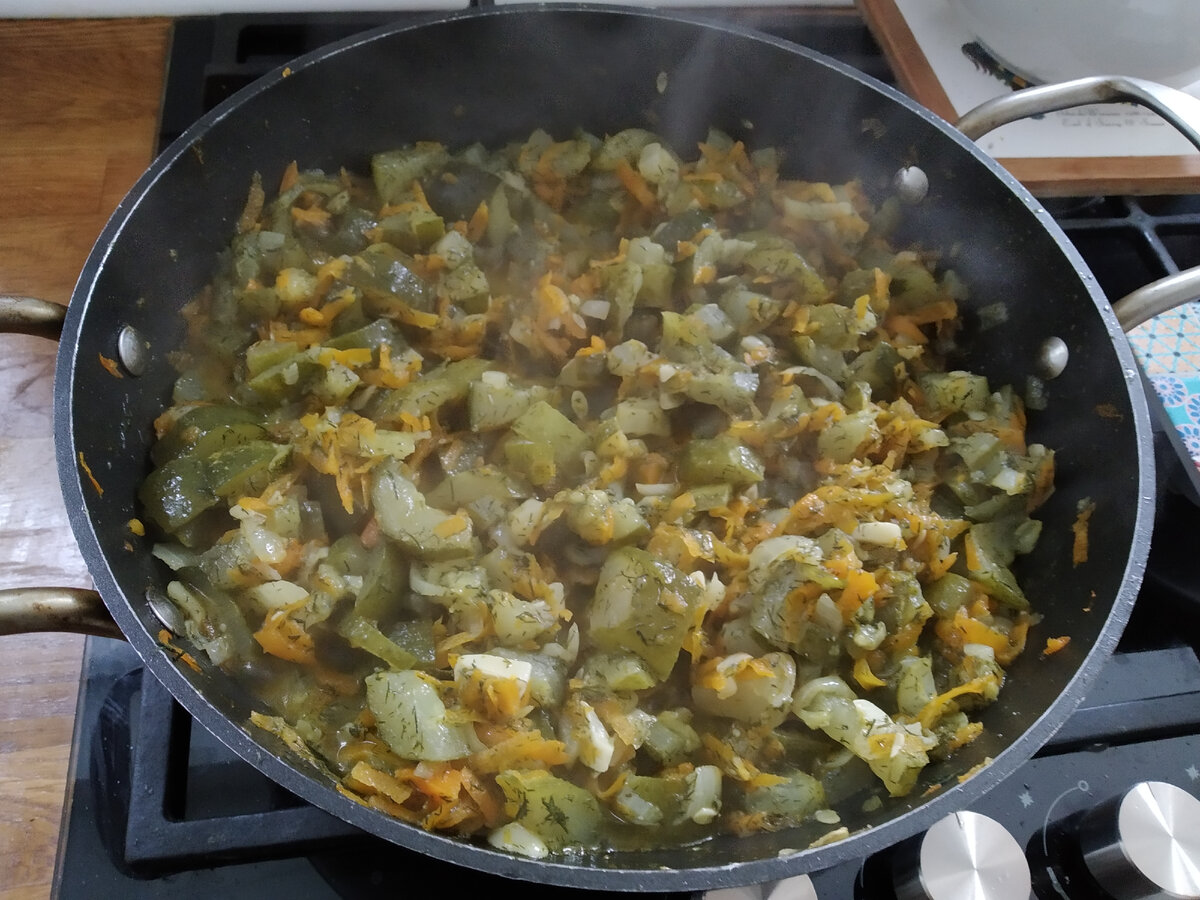 - Тушить блюдо без крышки на среднем огне 5 минут, а затем уменьшить до слабого.