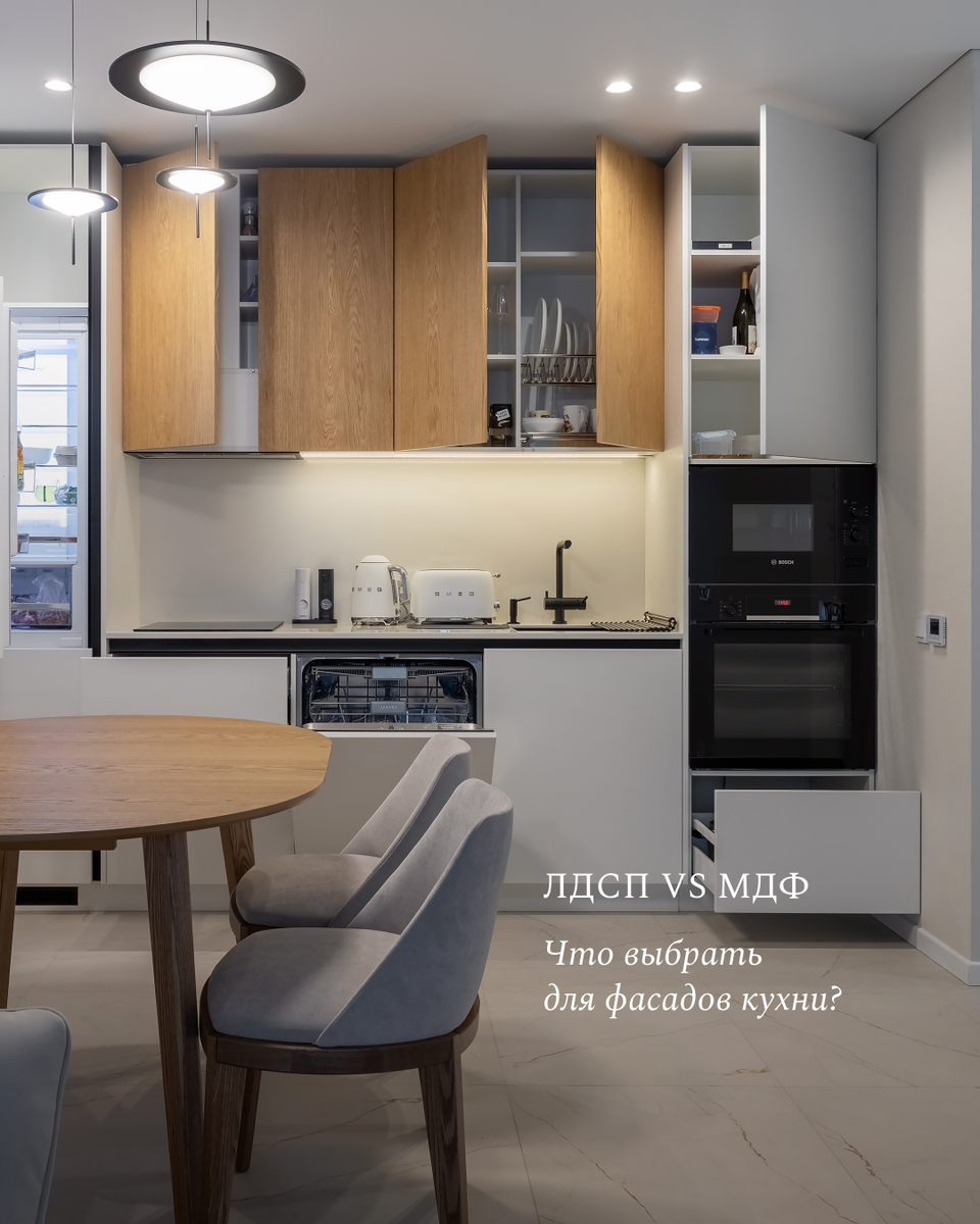МДФ — подходит для фасадов с фрезеровкой, сложными формами и дизайнерскими решениями. Это плотный материал, более устойчивый к внешним воздействиям.