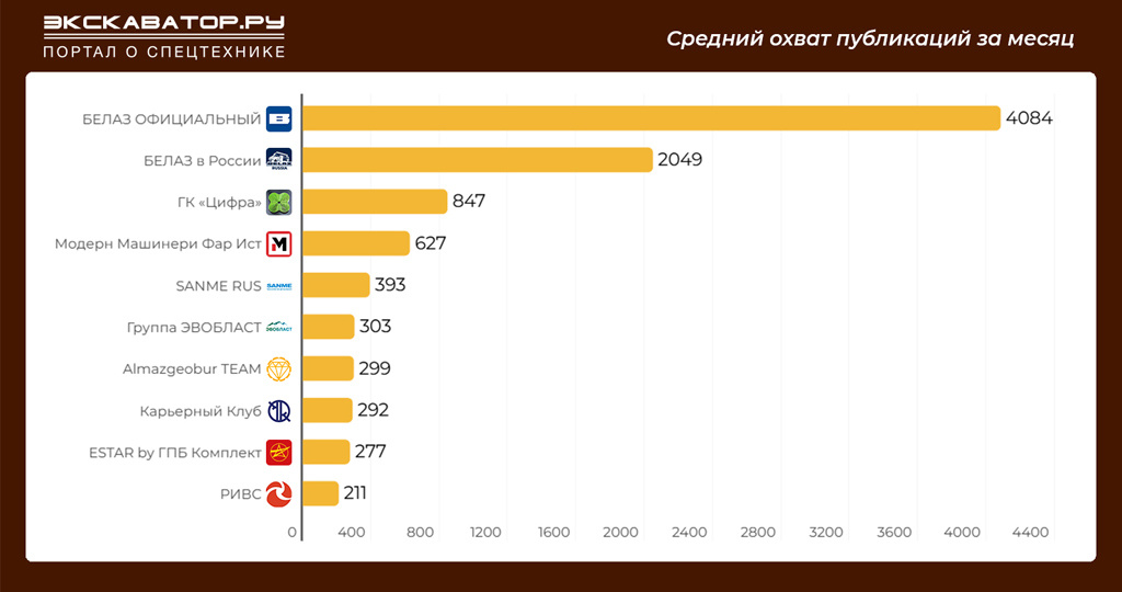 Экскаватор Ру совместно с TGStat изучил активность поставщиков тяжёлой техники в Telegram и определил, чьи каналы самые успешные В качестве критерия ранжирования компаний был выбран средний охват публикаций за последний месяц. В рейтинг вошли производители и дилеры, работающие преимущественно в сегменте горнодобывающей техники. Поставщики, большинство публикаций которых посвящено дорожно-строительному направлению, ранее были представлены в топ-20 Telegram-каналов по спецтехнике. В топ-3 компаний вошло сразу два канала БЕЛАЗ: официальный и дополнительный по российскому рынку. Причём оба канала по охватам имеют значительный отрыв от конкурентов. Далее следует российский разработчик цифровых решений для горнодобывающей отрасли — ГК «Цифра». Также в числе лучших оказались: «Модерн Машинери Фар Ист» (широкий ассортимент тяжёлой техники), официальное представительство SANME (дробильное оборудование), Группа «ЭВОБЛАСТ» (производитель коммерческих взрывчатых веществ и средств инициирования), «