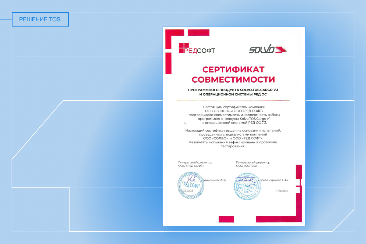 По результатам тестирования было установлено, что Solvo.TOS корректно работает под операционной системой «Ред ОС» версии 7.3. Сертификат совместимости был подписан 4 марта 2025 года. В дальнейшем будут проведены аналогичные работы по совместимости Solvo.TOS и «Ред ОС» версии 8.