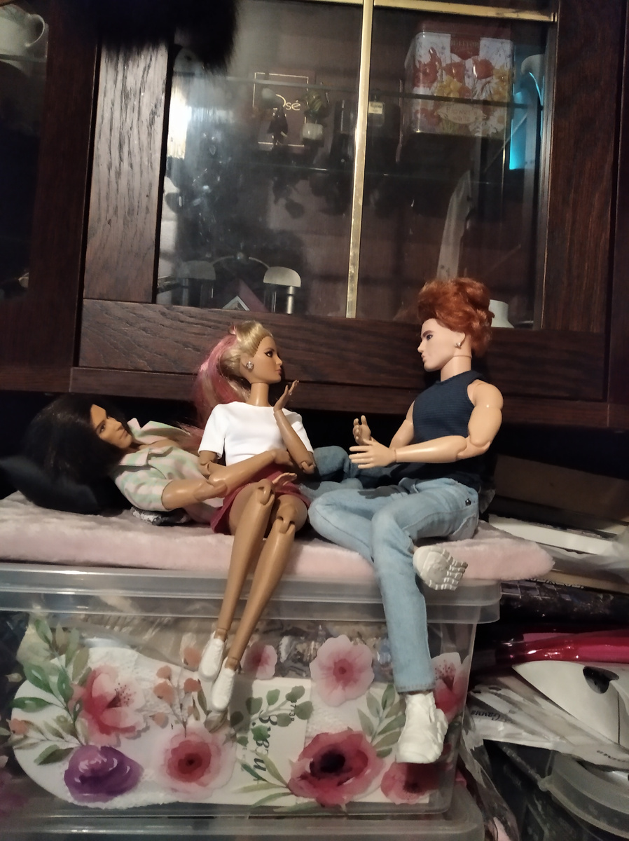 Некоторое время назад Ритка, Патрик и Стас съездили на дачу в компании Люциана, там они все прекрасно пообщались. Потом ещё все вместе полазили по развалинам в Царицыно. А когда вернулись, Патрик позвал Люциана с ними в их нору (Ритка и парни обычно обитают на коробке с шитьём). А когда Стас с Риткой стали намекать, что пора проводить гостя, Патрик сказал что-то типа "а не позвать ли Люциана в семью". Это не понравилось ни Люциану, ни Ритке со Стасом. Патрик ушёл с Люцианом и, они тоже поссорились на пятачке. Люциан возмутился, что ребята больше не захотят с ним общаться из-за слов Патрика. На следующую прогулку я взяла Ритку, Стаса и Люциана, а Патрика оставила дома - не хотелось разборок и хотелось показать Люциану, что на него не сердятся. Потом Патрик пришёл домой, и ему решили всё высказать. Патрик захотел взять Ритку на руки - она не согласилась, он пытался косить под дурачка и представить всё как шутку, но не прокатило - слишком хорошо Ритка и Стас его знают. Мне сложно перевес