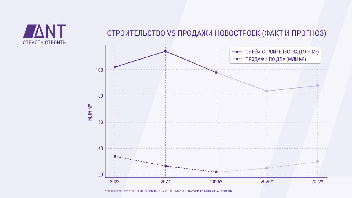 Рынок жилья в 2025 году меняется. Строительная активность остаётся высокой, но спрос остывает, продажи снижаются, застройщики накапливают долговую нагрузку и ищут новые финансовые механизмы. Продажи новостроек снизились на 22% За январь–июль 2025 года реализовано всего 12,3 млн м² (-22% г/г), или 259 тыс. квартир (-23%), на сумму 2,5 трлн ₽ (-13%). В июле зафиксирован кратковременный рост: 1,9 млн м² (+6% г/г). По мнению аналитиков это связано с низкой базой: в июле прошлого года рынок «просел» после завершения льготной ипотеки. На 1 августа 2025 года распроданность новостроек упала до 70% (–7 п.п. с января). Напомним, в 2024 году введено 114,4 млн м² жилья, но этот объём всё меньше конвертируется в спрос. Запуск новых проектов сокращается: –19% г/г (21,2 млн м² против 26,1 в 2024 г.). — в сторону ИЖС, где активно поддерживаются региональные программы и субсидии; За январь–май 2025 года ИЖС составило 74% общего ввода жилья, при этом темпы его ввода выросли на 7% г/г, а МКД сократился н