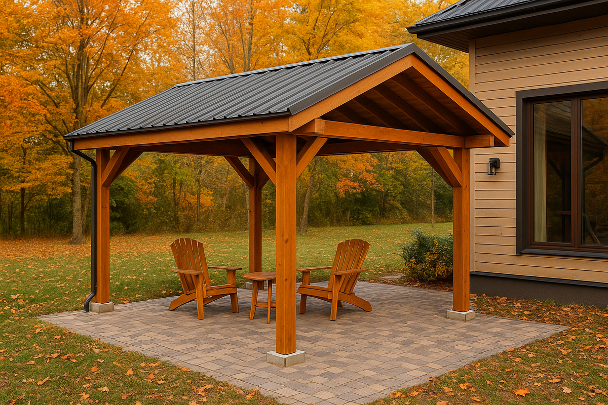 Навес — это не просто крыша над головой. Это часть участка, которая должна защищать и служить долго. Особенно в Беларуси, где осень — с дождями, зима — с перепадами температур, а весной всё «цветёт» плесенью. Разбираемся, какие решения действительно работают — по факту, а не по рекламе. Часто под «умным» навесом подразумевают красивую картинку в Pinterest или конструкцию с поликарбонатом на тонких опорах. Но умность — не в дизайне, а в технологии. Такой навес должен: Самая частая ошибка — слишком тонкие стойки. Для устойчивости навеса в наших широтах минимально допустимая толщина опоры — 100×100 мм, а лучше — 120×120 мм. Иначе конструкция может повести от ветра или снежной нагрузки. Подходящие материалы каркаса: Поликарбонат — популярный, но далеко не всегда лучший вариант. На солнце он сильно нагревается, на нём скапливается конденсат. Кроме того, через пару лет он мутнеет и может трескаться на морозе. Что реально работает: Миф: «Достаточно один раз покрасить — и всё».