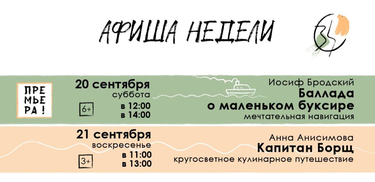 🎭 Афиша недели в Театре «ТриЧетыре» На сцене – премьера и долгожданное возвращение любимого героя! Эта неделя – про мечты, путешествия и волшебство повседневного. 20 сентября, суббота 🚢 Премьера! «Баллада о маленьком буксире» – 12:00 и 14:00 По поэме Иосифа Бродского. Мечтательная навигация маленького, но незаменимого трудяги из Питерского порта. 21 сентября, воскресенье 🥣 «Капитан Борщ» – 11:00 и 13:00 Кулинарное кругосветное путешествие с запахом овощей и доброты. 💚 Билеты уже доступны! Приходите всей семьёй – будет тепло, вкусно и по-настоящему театрально.