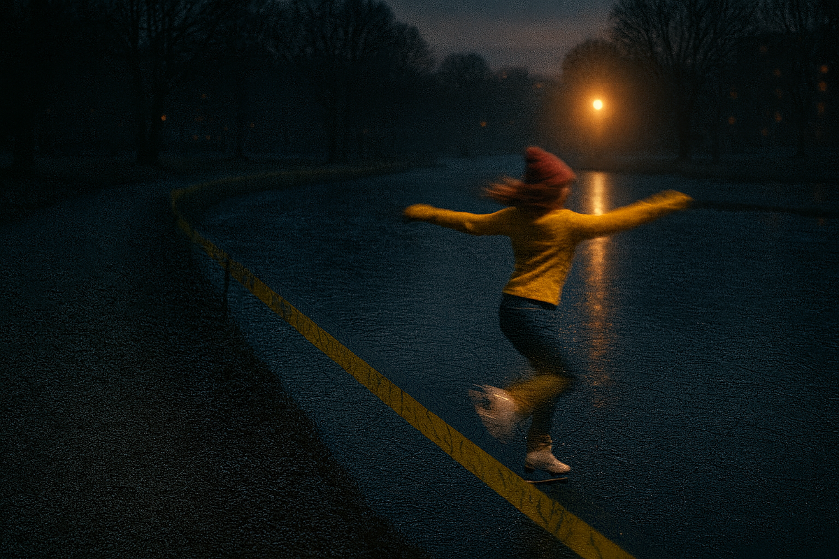 Это была девушка, легкая и худенькая, в желтом, облегающем фигурку свитере с высоким воротом. В красной вязаной шапочке. В желтых перчатках. Я стоял в тени ивы, свесившей на лед свои полуобнаженные ветки, и с интересом следил за неожиданным представлением. Сам я катаюсь неважно, но способен оценить чужое мастерство, а девушка таковым, несомненно, обладала. Не знаю, заметила ли она меня, думаю, да, потому что подобрала большой кленовый лист и помахала им в мою сторону. Я невольно оглянулся: не стоит ли кто-то из ее знакомых у меня за спиной. Нет. Никого. Только деревья и кусты с поредевшей листвой.