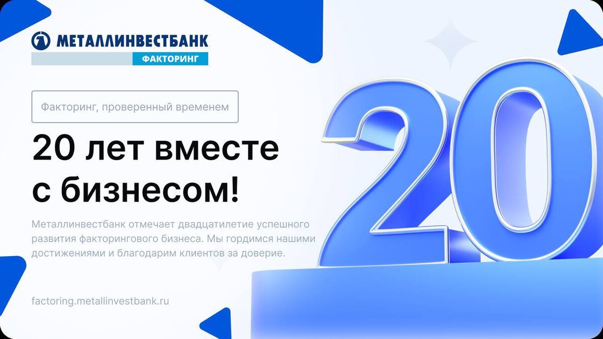 Металлинвестбанк.Факторинг – 20 лет вместе с бизнесом! 🎉 С гордостью и благодарностью мы отмечаем важную веху в истории нашего Банка – 20 лет успешного развития факторингового бизнеса! 🏆 С 2005 года мы поддерживаем бизнес, становясь надёжным партнёром для сотен компаний. Особая гордость – клиенты и сотрудники, которые с нами с первого дня. Это история доверия и совместного роста. "Внимательность и умение слышать сделали компанию не просто факторинговым оператором, а настоящим партнером. Здесь не предлагают решения “в общем”, здесь вникают в нюансы, учитывают сезонность, внутренние процессы, стратегические цели и даже характер управления", – так описывает философию работы Директор Департамента факторинга Прохоров Александр. К 20-летию мы сделали праздничную страницу 🎉 с историями успеха, отзывами клиентов и поздравлениями команды. Мы желаем больших успехов и процветания Банку и нашим любимым клиентам! 💙