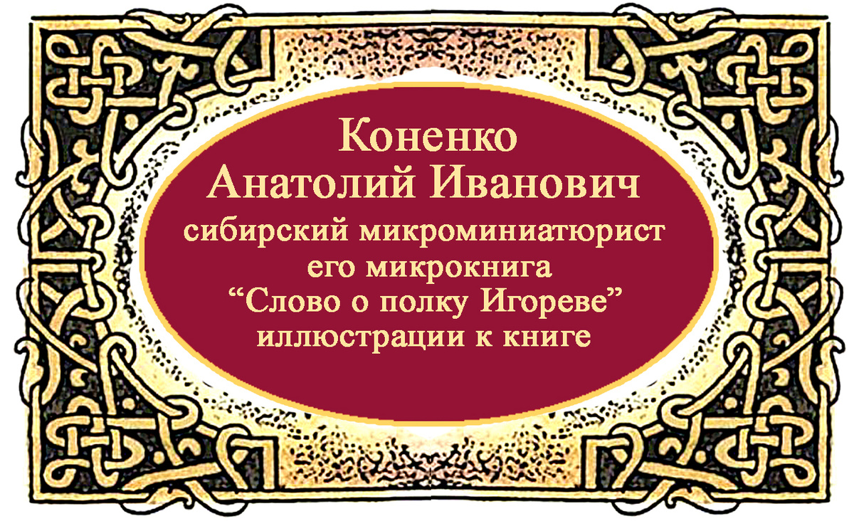 Подбирая иллюстративный материал к публикации «Мотивы кельтских, скандинавских, славянских узоров и орнаментальной вязи и различных их интерпретаций,» случайно набрёл на иллюстрацию А. И. Коненко к его микрокниге «Слово о полку Игореве». Иллюстрация скачиваться не хотела, зашёл на сайт и вот тут то очень подробно познакомился с творчеством Анатолия Ивановича. творчество его очень многогранно и скорее всего потому что он худграфовец. Худграфовцы отличаются от выпускников специализированных художественных вузов своим отношением к различным материалам и технике работы с ними. Анатолий Иванович молодец, что выбрал микроминитюаризацию основным направлением всего своего творчества и это у него великолепно получилось. Анатолий Иванович Коненко родился 23 февраля 1954 года в Орске Оренбургской области. Окончил Омский строительный техникум по специальности «техник-архитектор». В 1982 году окончил художественно-графический факультет ОмГПУ. В 1981 году он начал заниматься искусством микроминиатюр