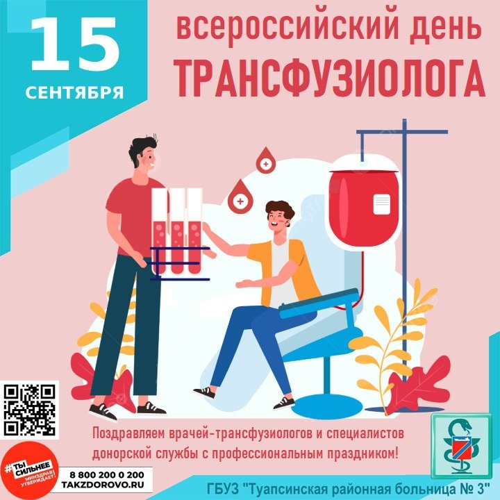 ЧЕМ ЗАНИМАЕТСЯ ТРАНСФУЗИОЛОГ? Врач-трансфузиолог проводит медицинское обследование доноров и реципиентов донорской крови или ее компонентов, для чего проводит ряд мероприятий: -определяет необходимый объем лабораторного исследования образцов донорской крови; -анализирует и интерпретирует информацию, полученную от доноров при сборе анамнеза и осмотре; -по результатам лабораторного исследования образцов крови оценивает функциональное состояние органов и систем организма донора для предупреждения нежелательных реакций и осложнений; -оказывает неотложную медицинскую помощь при их возникновении; -анализирует значения показателей безопасности донорской крови или ее компонентов; -ведет учет инфицированных лиц, выявленных среди доноров и реципиентов: -организовывает хранение и транспортировку донорской крови и . От всей души поздравляем врачей-трансфузиологов и специалистов донорской службы с профессиональным праздником! Подробнее на нашем сайте: http://hosp23.ru/medevents/265-russiantransf