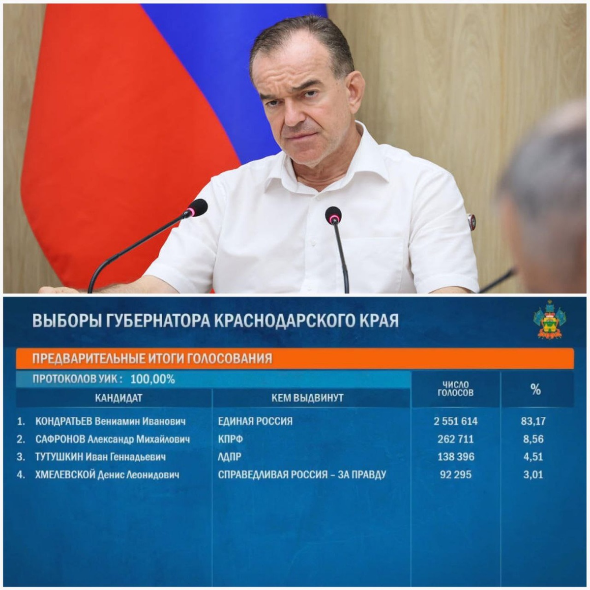 Вениамин Кондратьев набирает 83,17% (2 551 614) голосов после подсчета 100% протоколов, сообщает ЦИК РФ. 👍 ТК Краснодар | Подписаться