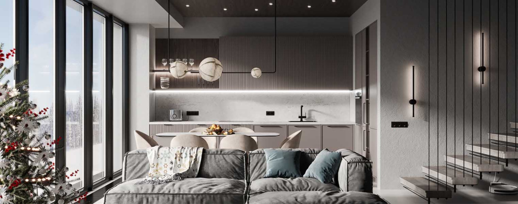 Поэтому очень важным элементом дизайна любого помещения является освещение. Оно должно полностью компенсировать нехватку естественной освещенности. Схема освещения не только максимально использует дневной свет, но включает в себя яркие источники света, расположенные над рабочей или обеденной зоной, заполняющее освещение, декоративную подсветку ниш, шкафов и полок, локальные светильники в кабинете, спальне или детской комнате.