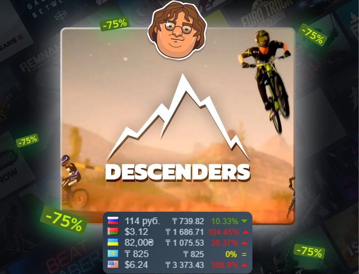 Экстремальный симулятор даунхилла на горном велосипеде Descenders теперь доступен со скидкой 75%. Игроки могут насладиться генерируемыми трассами и реалистичной физикой падений и трюков. Основная цель игры — спуск на скорости с риском для жизни и стилем. 🚵♂️💨Специальное предложение позволяет приобрести игру за 114₽, 825₸ или 82₴. Акция продлится до 23 сентября, так что у всех желающих есть время воспользоваться выгодным предложением. 🗓Descenders предлагает уникальный опыт для любителей экстремальных видов спорта и велосипедных гонок. Реалистичная физика и генерируемые трассы делают каждую гонку уникальной и захватывающей. 🎉Не упустите возможность добавить эту захватывающую игру в свою коллекцию по выгодной цене. 🔗 Больше новостей смотрите на News.Mentup
