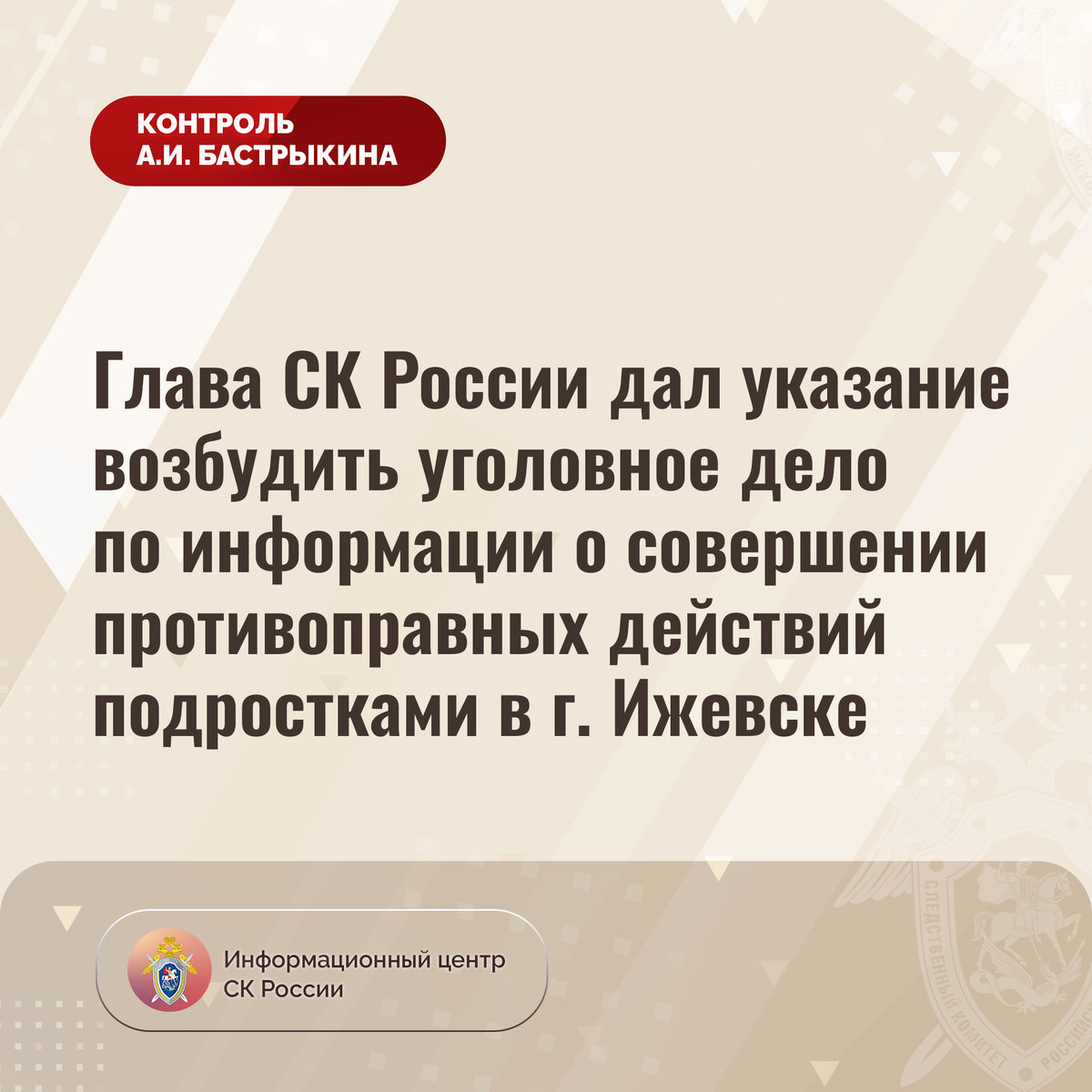 Глава СК России дал указание возбудить уголовное дело по информации о совершении противоправных действий подростками в г. Ижевске