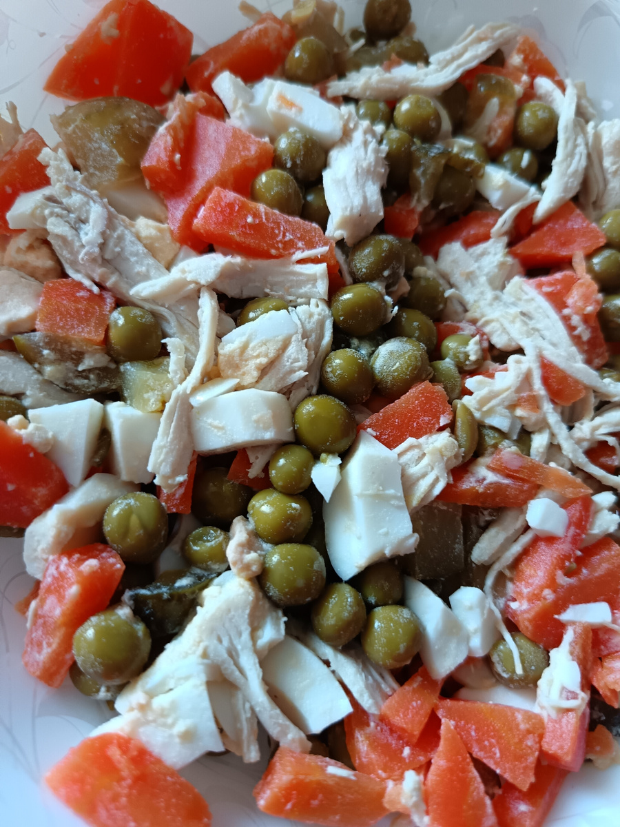 Ингредиенты : - куриное филе - горошек - отварная морковь - отварные яйца - солёные огурцы - отварной картофель ( по желанию) - майонез Приготовление : 1. Отварное куриное филе разделяем на волокна. 2. Нарезаем кубиком морковь, яйца и солёные огурчики. 3. Добавляем горошек. 4. Заправляем салат майонезом. 5. Соль по вкусу. Приятного аппетита!!!