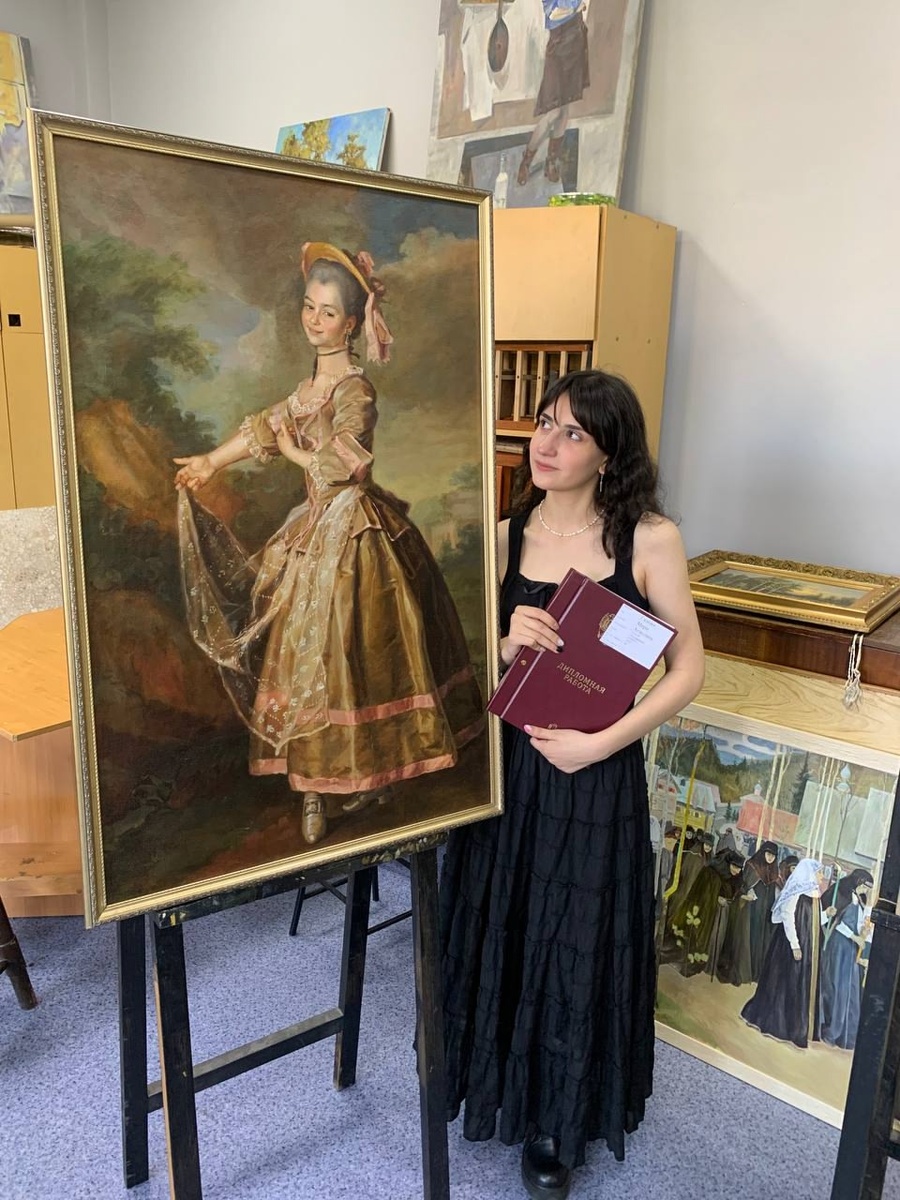 Студентка Инженерной школы одежды (колледжа) СПбГУПТД Мери Галоян создала копию картины «Портрет Е. И. Нелидовой» русского живописца Дмитрия Левицкого. На картине изображена ученица Смольного института благородных девиц — первого в России женского учебного заведения. «Это парадный портрет для дворцовой залы. Левую часть полотна художник оставляет пустой для создания легкого и изящного образа. Еще один прием — изображение модели на низком горизонте. Это придает Нелидовой возвышенности, а ритмы делают композицию гармоничной — все линии фона стремятся к ее фигуре», – рассказывает Мери. Работа с копией позволяет изучить сложные техники и приемы старых мастеров. В частности, Мери изучила технику живописи XVIII века и самого Левицкого, который использует имприматуру — предварительную цветную тонировку холста, и лессировку — нанесение красок просвечивающим слоем. Самой трудоемкой стала работа над кружевом, так как необходимо было точно передать манеру автора в создании текстуры легкой, узорно