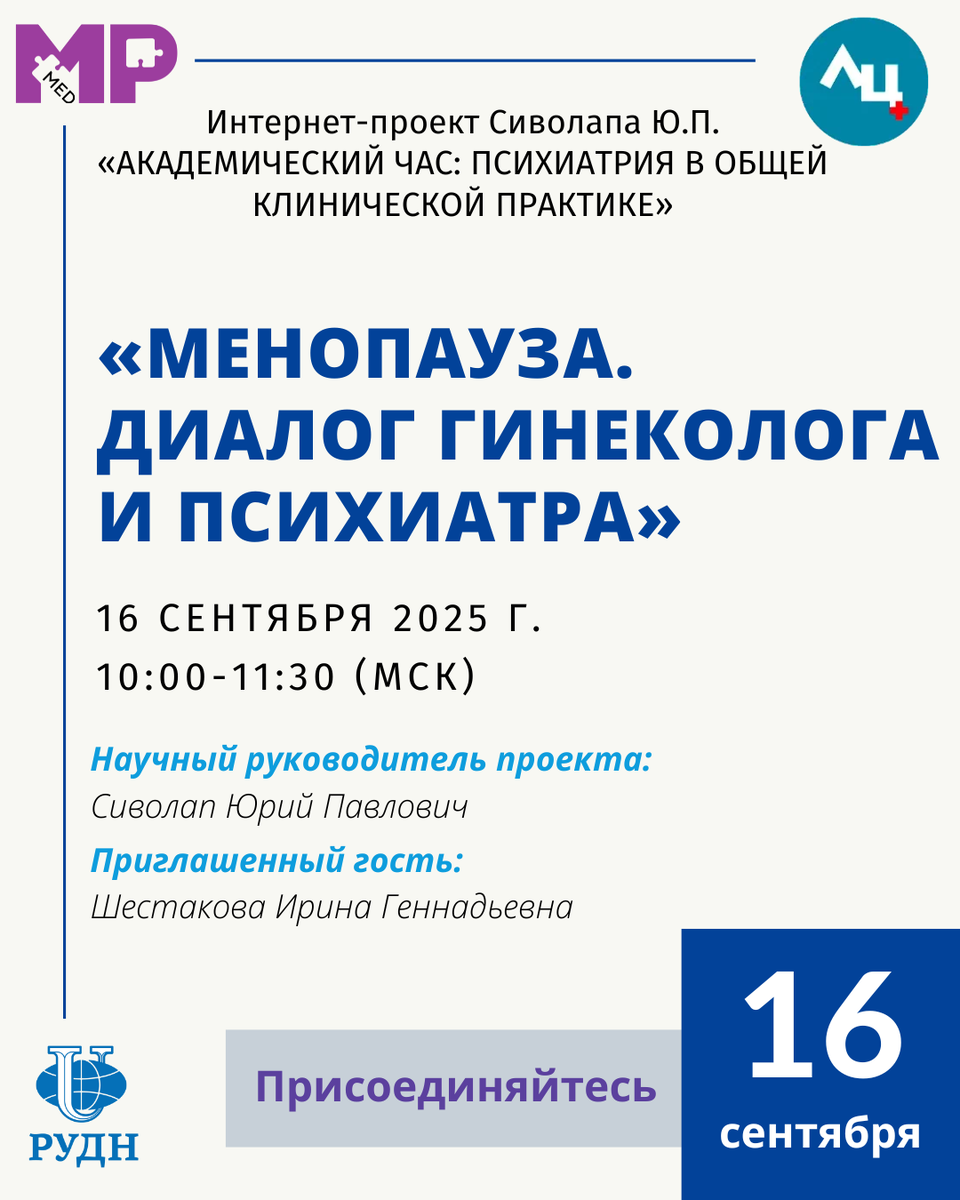 Уважаемые слушатели, приглашаем Вас к участию в интернет-проекте Сиволапа Ю.П. «Академический час: Психиатрия в общей клинической практике: Менопауза. Диалог гинеколога и психиатра»