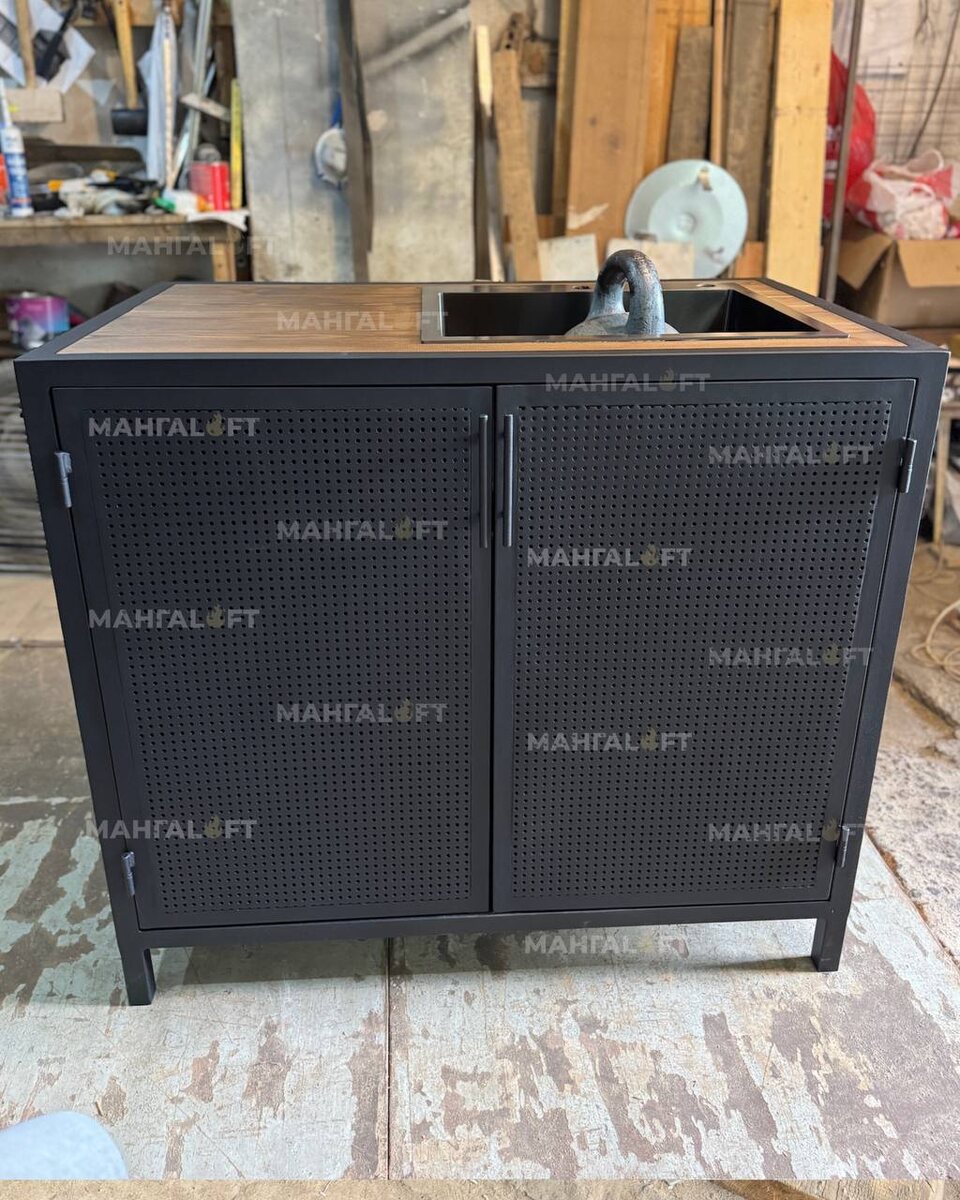 Закрытый модуль с мойкой у нас в проектах встречается давно. Чаще всего дверцы мы выполняем из лиственницы — дерево придаёт уюта, а также приятно на ощупь. Но в этом проекте решили попробовать другое решение: дверцы сделали из металла с перфорацией. Получилось современно и стильно, но при этом всё так же функционально. А ещё мы добавили небольшой штрих — фирменный лого на корпусе. Мелочь, но именно такие детали задают настроение и подчеркивают стиль изделия. Важны ли для вас такие детали в мангальном комплексе? Или смотрите исключительно на практичность?