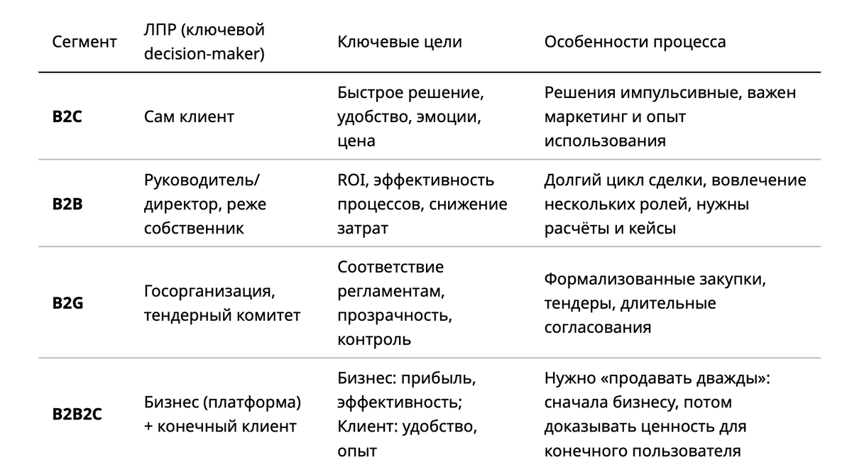 Любая стратегия продаж, маркетинга и даже сама архитектура продукта зависит от того, кто твоя аудитория и как устроен процесс покупки. Чтобы было понятно на практике, давай посмотрим в виде таблицы. 👉 Если этого не понять в самом начале, можно сделать продукт, которым удобно пользоваться, но который никто не купит. 🔧 Инструмент: Матрица «Кто покупает / Кто платит / Кто пользуется» 💡 Примеры продуктов в разных сегментах 📊 Как применить на практике