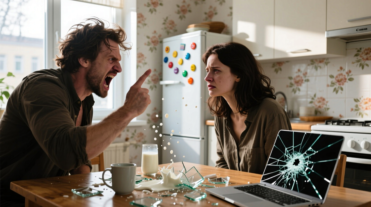 Лицо Игоря исказилось. Он шагнул вперёд — Наталья инстинктивно прикрыла лицо руками. Но удара не последовало. Вместо этого муж схватил её ноутбук и со всей силы швырнул на пол.
