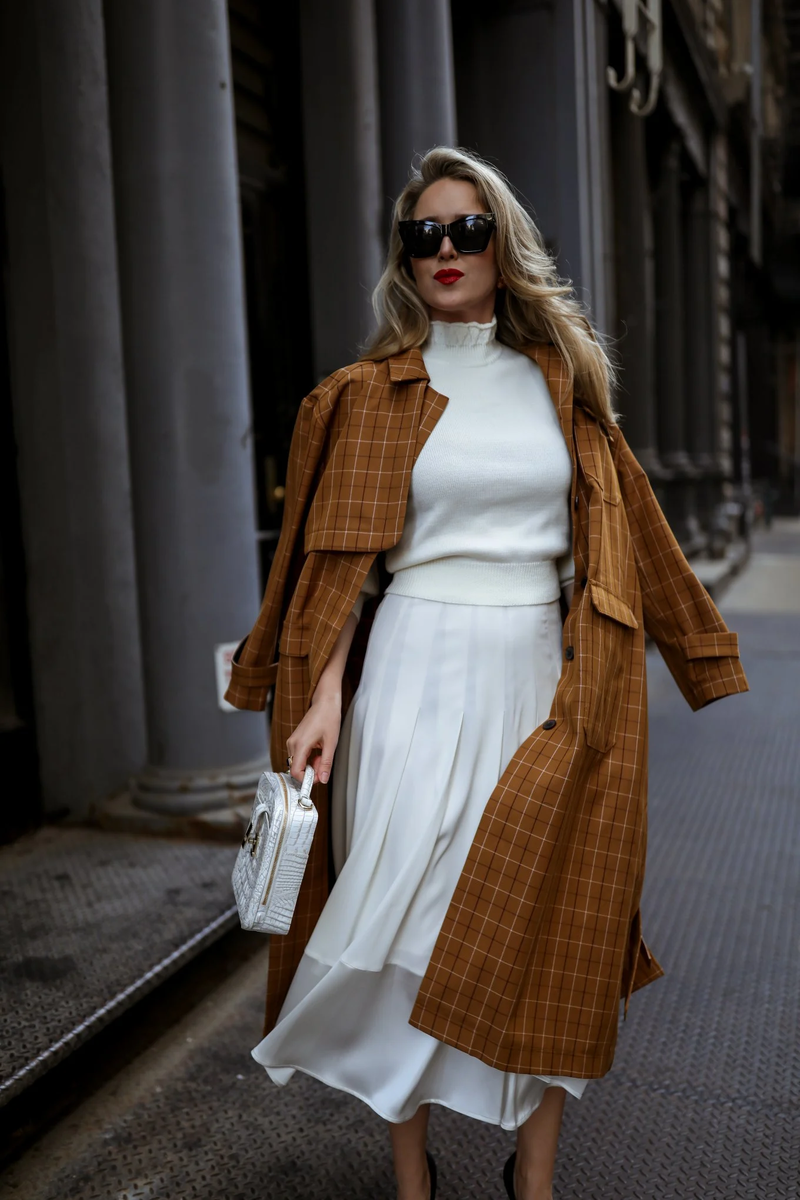 Как собрать: монохром + объёмные формы. В качестве акцента — большая сумка-тоут или шарф-плед. Total-look этой осени = уверенность