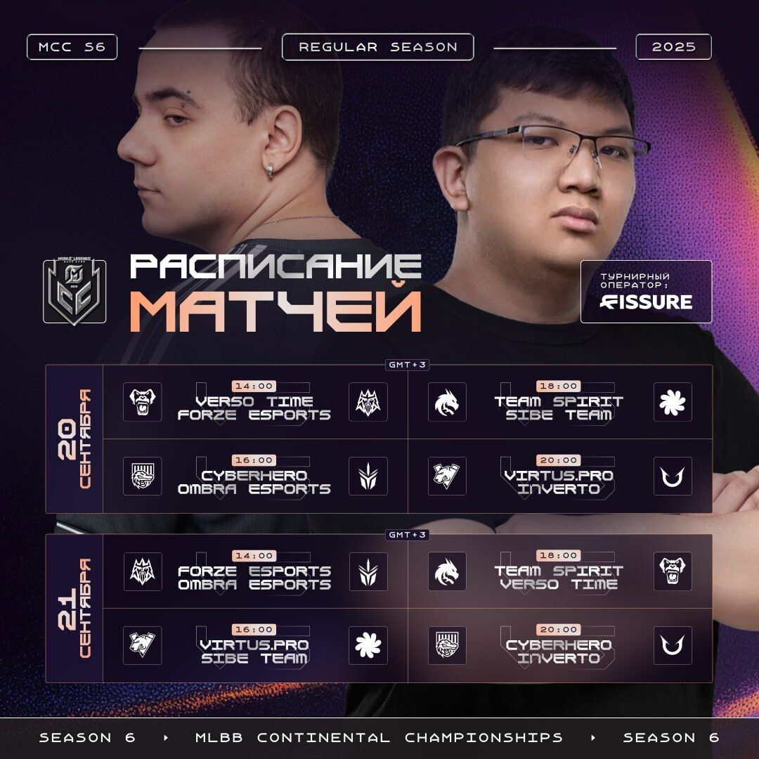Каждые выходные продолжается напряженная борьба за чемпионскую корону в рамках MCC S6. Впереди участников ждет еще шесть недель регулярного сезона, наполненных захватывающими матчами и острой конкуренцией. 🔥Расписание второй недели MCC S6 (GMT+3) обещает быть насыщенным и интересным.20 сентября (суббота):14:00 — 🐵 Verso Time встретятся с 📛 FORZE Esports.16:00 — 🐊 CyberHero сразятся с 💗 OMBRA Esports.18:00 — 🐉 Team Spirit выйдут против 🌀 Sibe Team.20:00 — 🐻 Virtus.pro сразятся с 🔰 Inverto.21 сентября (воскресенье):14:00 — 📛 FORZE Esports встретятся с 💗 OMBRA Esports.16:00 — 🐻 Virtus.pro выйдут против 🌀 Sibe Team.18:00 — 🐉 Team Spirit сразятся с 🐵 Verso Time.20:00 — 🐊 CyberHero встретятся с 🔰 Inverto.Важно напомнить, что две лучшие команды регулярного сезона автоматически пройдут в плей-офф. Остальным участникам предстоит сражаться в плей-ин за право остаться в турнире и продолжить борьбу за чемпионский титул.Календарь чемпионата:📅 Регулярный сезон: 13 сентября - 26 октября.📅 Плей-ин: 1-2 ноября.📅 Плей-офф: 13-16 ноября.Болельщики могут ожидать множество захватывающих моментов и напряженных матчей в предстоящие недели.