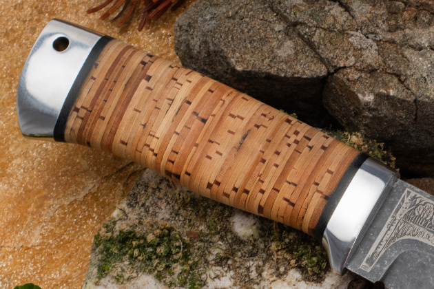 Для любого охотника охотничий нож, как и ружьё, является объектом гордости. Поэтому многие пытаются сами изготовить если не клинок, то хотя бы рукоять к своему ножу. Сделать самостоятельно наборную рукоять для ножа не составляет труда для человека, мало-мальски умеющего работать с ножом, наждачной бумагой и напильником. Для набора рукоятки можно использовать различные материалы: дерево, металл, кожу, кору деревьев, в частности бересту от березы, а также чередовать между собой указанные выше материалы. Самый распространенный материал для изготовления рукояти ножа — это береста. Несложная в обработке, доступность материала, не требующего какой-либо специальной обработки. Заготавливают ее заранее, снимая пластом. Это можно сделать, сняв бересту с березовых чурок, напиленных на дрова, или же на лесозаготовках с уже спиленных стволов березы, дабы не вредить растущим деревьям. Толщина бересты большой роли не играет, но, как у нас принято говорить, чем больше, тем лучше. Снятый пласт бересты