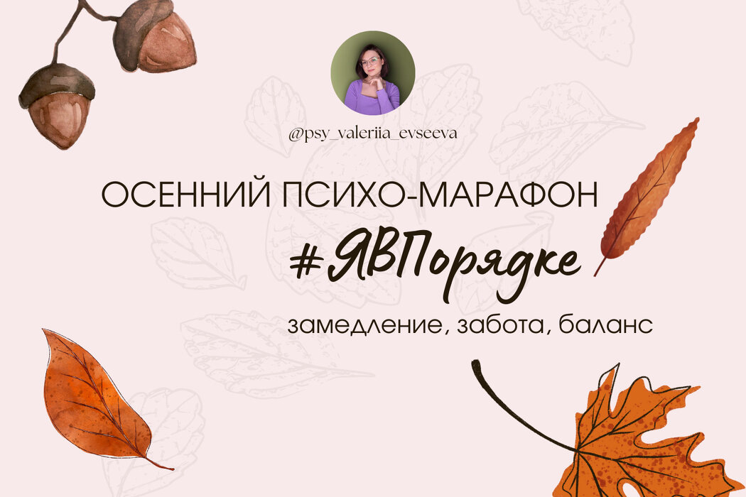 Нынешний темп жизни вынуждает нас бежать марафон в формате спринта. Мы стараемся быстрее всё успеть, урвать, заполучить, достичь и, зачастую, среди этой гонки теряем себя. Мы забываем наделять смыслом и ценностью свои будни, свои решения и действия, отчего сильнее истощаемся и выгораем. Осень – самое время, чтобы остановиться и обратить на себя внимание. Но не для того, чтобы, набравшись сил бежать ещё быстрее, а для того, чтобы познать ценность свою и своей жизни. Только так можно соблюсти баланс во всех сферах своей жизни и начать наконец получать от неё удовлетворение. Я начинаю #марафон_явпорядке! Буду проходить сама и приглашаю вас. Никакой спешки, никакой обязаловки и достигаторства. Просто будем создавать пространство для доброго диалога с собой! День 1. «Скинуть листья – что я хочу отпустить…» 🍂 С чего бы начать марафон? С упражнений на замедление? С техник контроля своих эмоций? Или может с составления подробного алгоритма шагов, который поможет нам прийти к внутреннему б