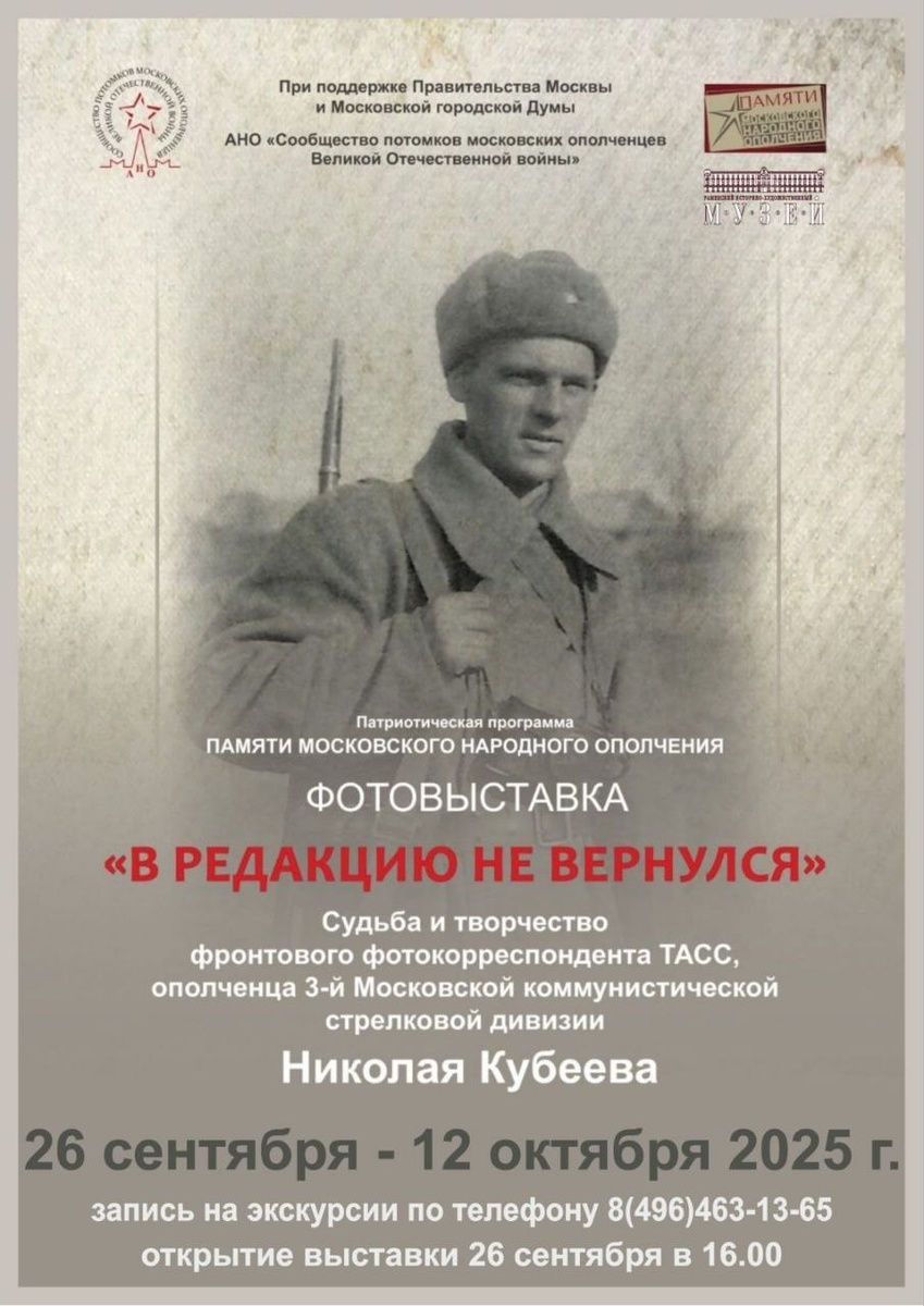 «В редакцию не вернулся» Выставка, посвященная судьбе и творчеству фронтового корреспондента ТАСС Николая Кубеева, откроется в Раменском историко-художественном музее 26 сентября. Николай Кубеев родился в Раменском, работал фотокорреспондентом ТАСС, а в 1941-м вступил в Московское народное ополчение. На выставке будет представлено более 150 фотографий и документов, как довоенных, так и сделанных на фронте. Выставка доступна для посещения по входному билету в музей (100 руб. взрослый, 50 руб. для школьников), также по ней будут регулярно проводиться экскурсии. Запись на экскурсионные сеансы уже открыта. Открытие выставки состоится в 16 часов. На церемонии будет сын Николая Кубеева - писатель, историк Михаил Кубеев, а также представители ТАСС, создатели и организаторы выставки. Раменский историко-художественный музей находится ул. Воровского, д. 7, 3-й этаж. Подписаться | Предложить новость