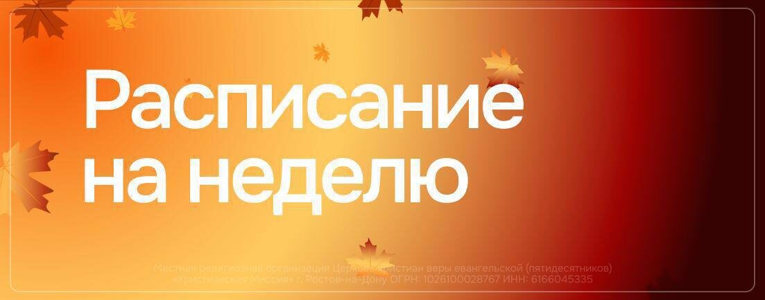 ✨СОБЫТИЯ НЕДЕЛИ✨ 15 СЕНТЯБРЯ - 21 СЕНТЯБРЯ Запланируйте свое время, чтобы посетить предстоящие мероприятия церкви 🤍💒🫶🏻 15 СЕНТЯБРЯ — ПОНЕДЕЛЬНИК ▪️ 8:00-9:00 общая молитва ЦХМ в ZOOM ▪️17:30 старт молодёжного курса «Наследники» 📍храм церкви ул.Зеленая 22 ▪️19:00 молитва церкви 📍офис церкви ул.Зеленая 24 16 СЕНТЯБРЯ — ВТОРНИК ▪️ 8:00-9:00 общая молитва ЦХМ в ZOOM 17 СЕНТЯБРЯ — СРЕДА ▪️ 8:00-9:00 общая молитва ЦХМ в ZOOM ▪️домашние группы 18 СЕНТЯБРЯ — ЧЕТВЕРГ ▪️ 8:00-9:00 общая молитва ЦХМ в ZOOM ▪️15:00 служение милосердия 📍Ц. Рынок ▪️19:00 курс «Библейское основание» 📍офис церкви ул.Зеленая 24 19 СЕНТЯБРЯ — ПЯТНИЦА ▪️ 8:00-9:00 общая молитва ЦХМ в ZOOM 20 СЕНТЯБРЯ — СУББОТА ▪️ 8:00-9:00 общая молитва ЦХМ в ZOOM ▪️10:00 курс «Сила здоровой семьи» 📍офис церкви ул.Зеленая 24 ▪️16:00 Женский клуб 📍храм церкви ул.Зелёная 22 21 СЕНТЯБРЯ — ВОСКРЕСЕНЬЕ ▪️ 8:00-9:00 общая молитва ЦХМ в ZOOM ▪️10:00 Богослужение 📍храм церкви ул.Зеленая 22 Благословенной недели 🙌🏻☺️🙏🏻