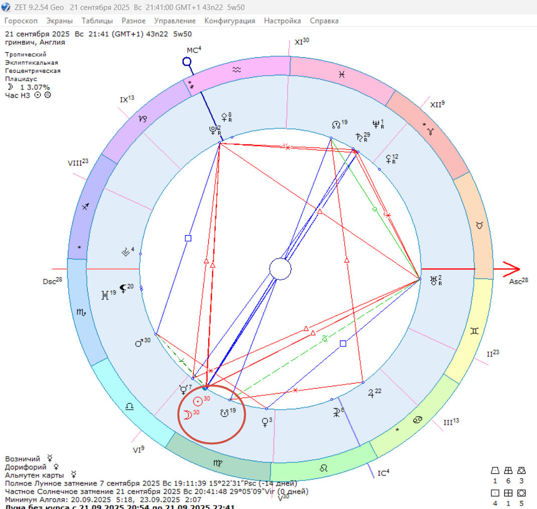 Уже вечером 21 сентября состоится Новолуние, которое из-за близости лунных узлов превратится в Солнечное затмение в последнем критическом 30 градусе Девы. Положение точки затмения в критическом градусе и на Южном узле говорит нам о том, что любые назревшие перемены получат ход хотим мы того или нет. А некоторые наши планы и действия, особенно относительно бизнеса, работы, личного роста и развития, переездов придется пересматривать и адаптировать, потому что внешняя среда заблокирует возможность их реализовывать в изначальном виде.