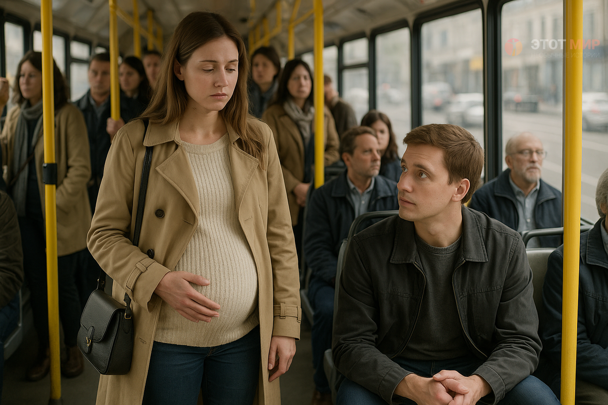 На повороте автобус резко тряхнуло. Анастасия вскрикнула, едва удержавшись. Рука инстинктивно легла на живот. Люди вокруг сделали вид, что ничего не заметили. Только Матвей мгновенно поднялся и уступил ей своё место. Она удивлённо посмотрела на него — будто давно не встречала настоящей доброты, — и благодарно опустилась на сиденье.